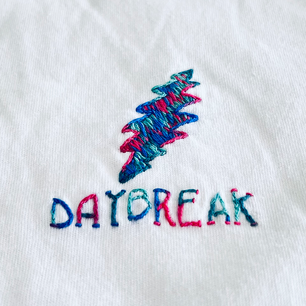 grateful dead 13-point lightning bolt, tie-dye satin stitch with "daybreak" text