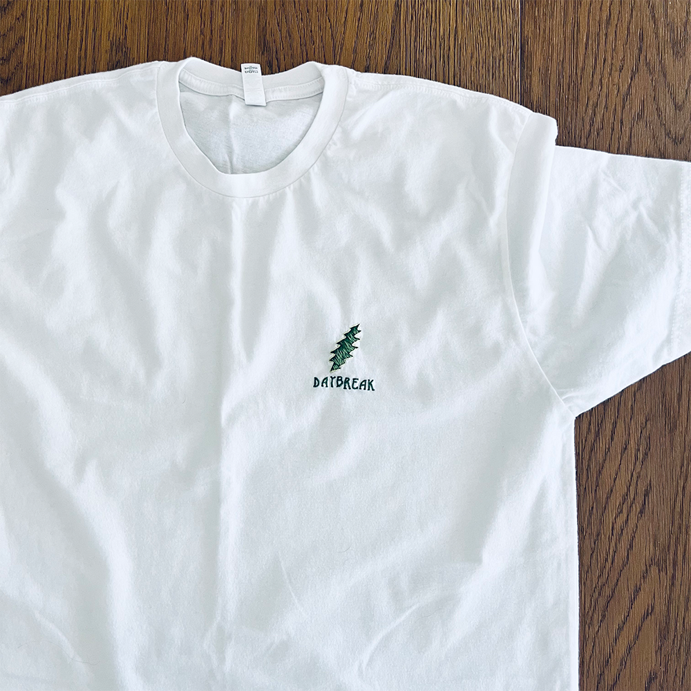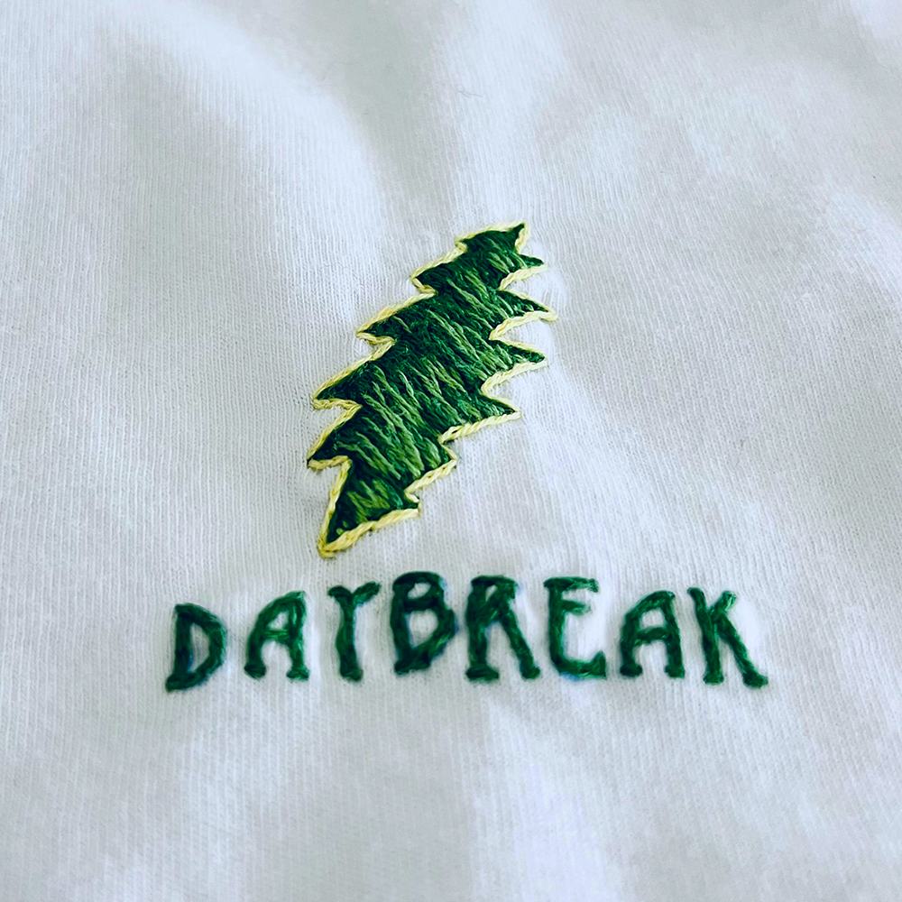 grateful dead 13-point lightning bolt, green satin stitch fill with "daybreak" text