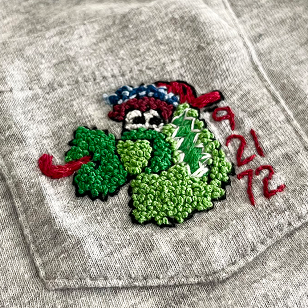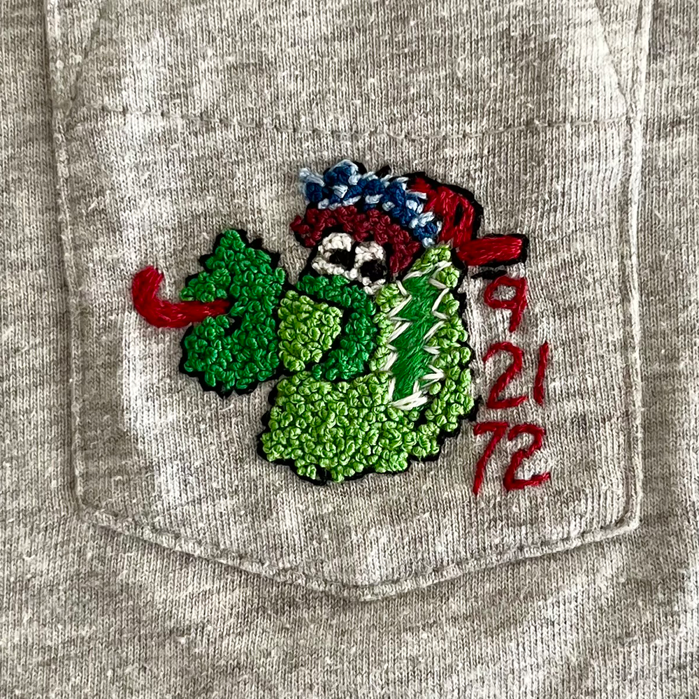 philly phanatic t-shirt with french knot fill, satin stitch grateful dead bolt and 9 21 72 textÂ