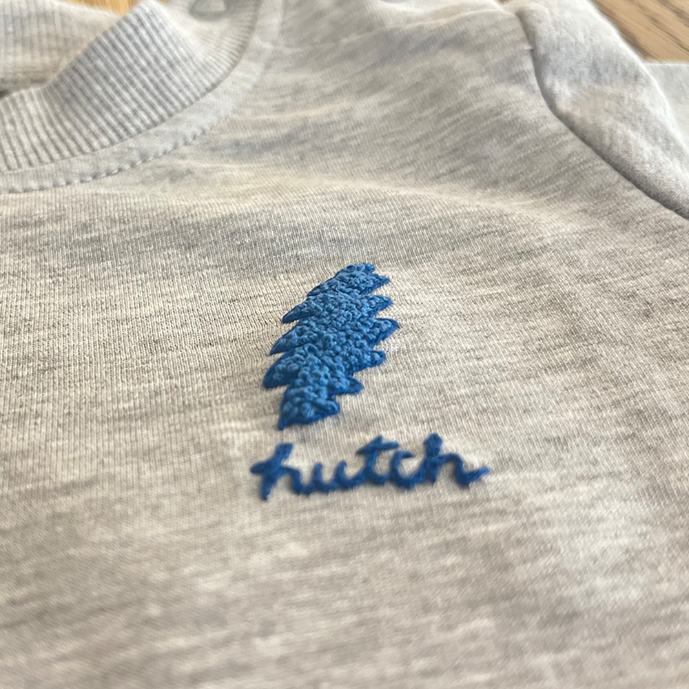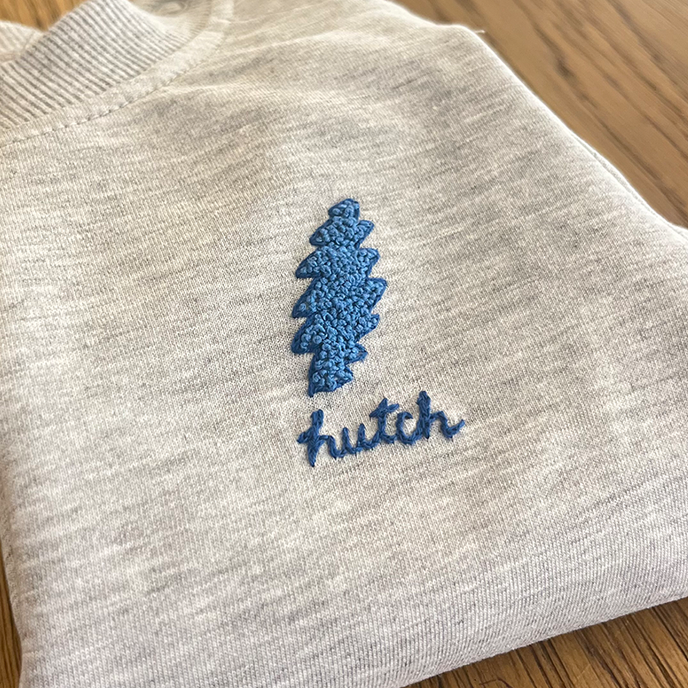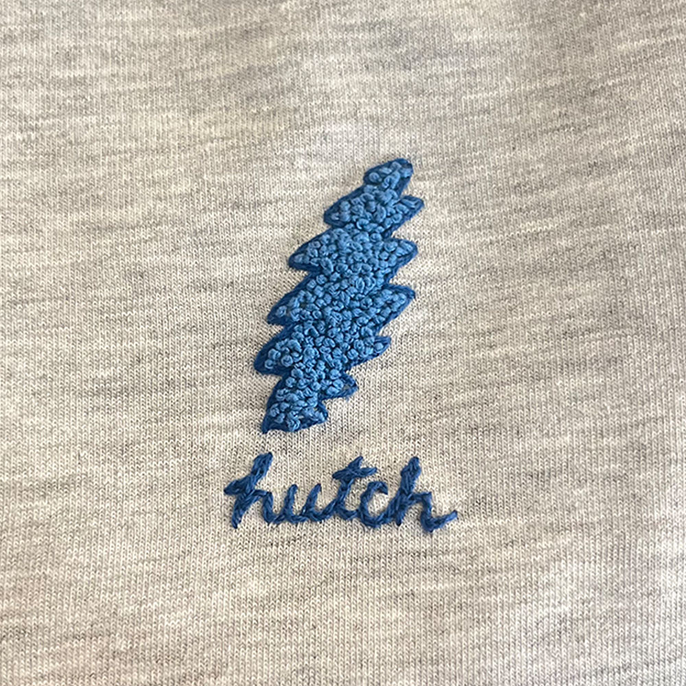 grateful dead 13-point lightning bolt, blue french knot fill with "hutch" script