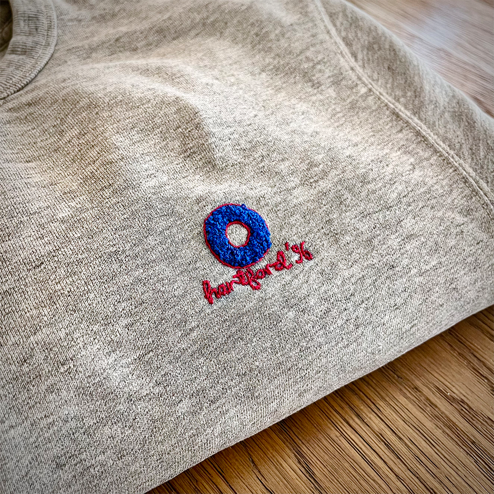 phish donut, red border with blue french knot fill and "hartford '96" script
