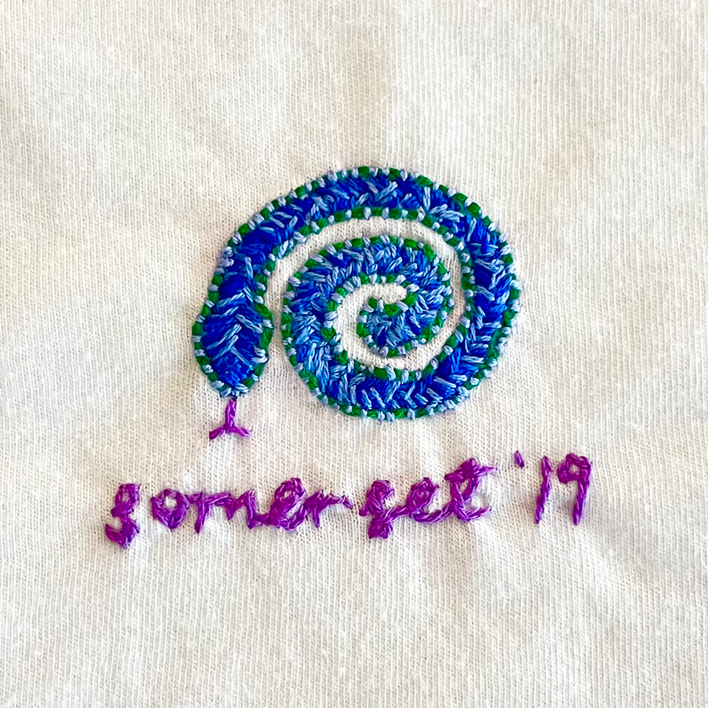 vampire weekend snake, blue satin stitch fill, green border with "somerset '19" script