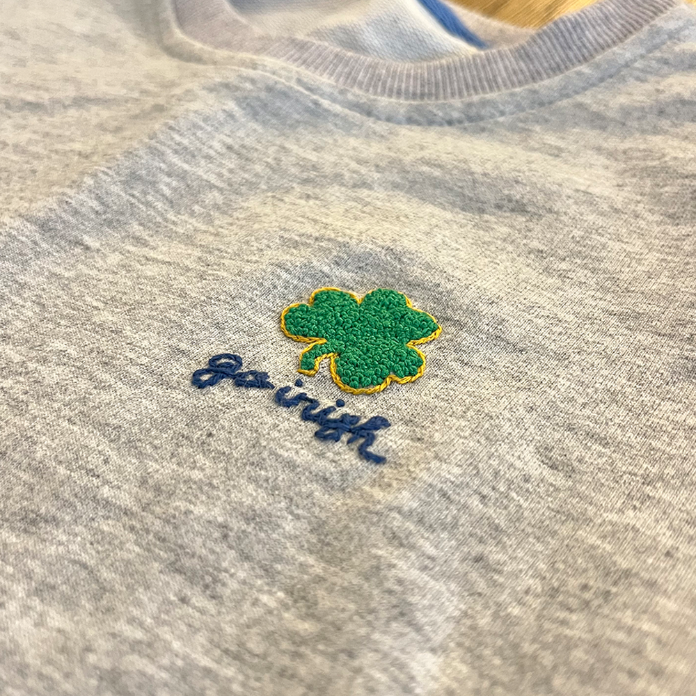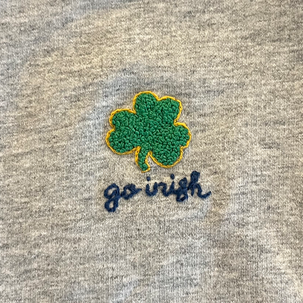 notre dame shamrock, green french knot fill with gold trim, blue "go irish" script