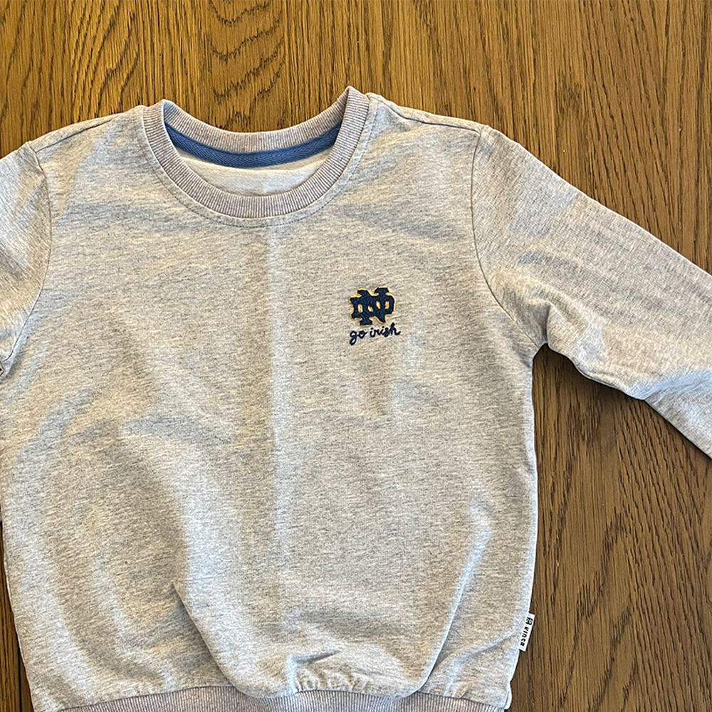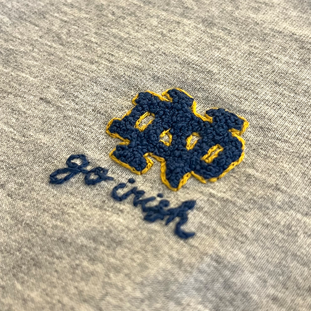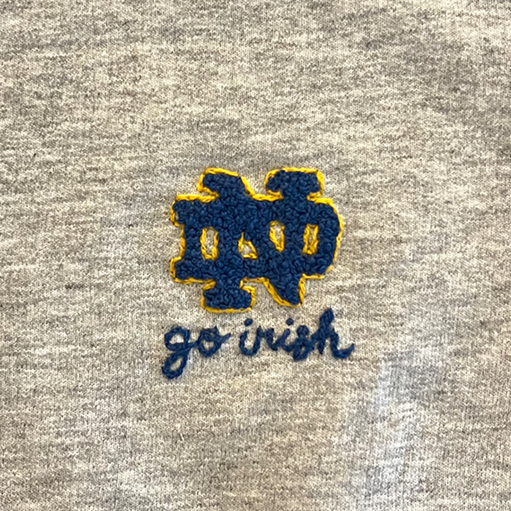 notre dame 'nd', blue french knot fill with gold trim, blue "go irish" script
