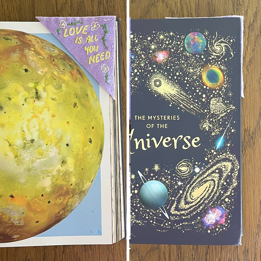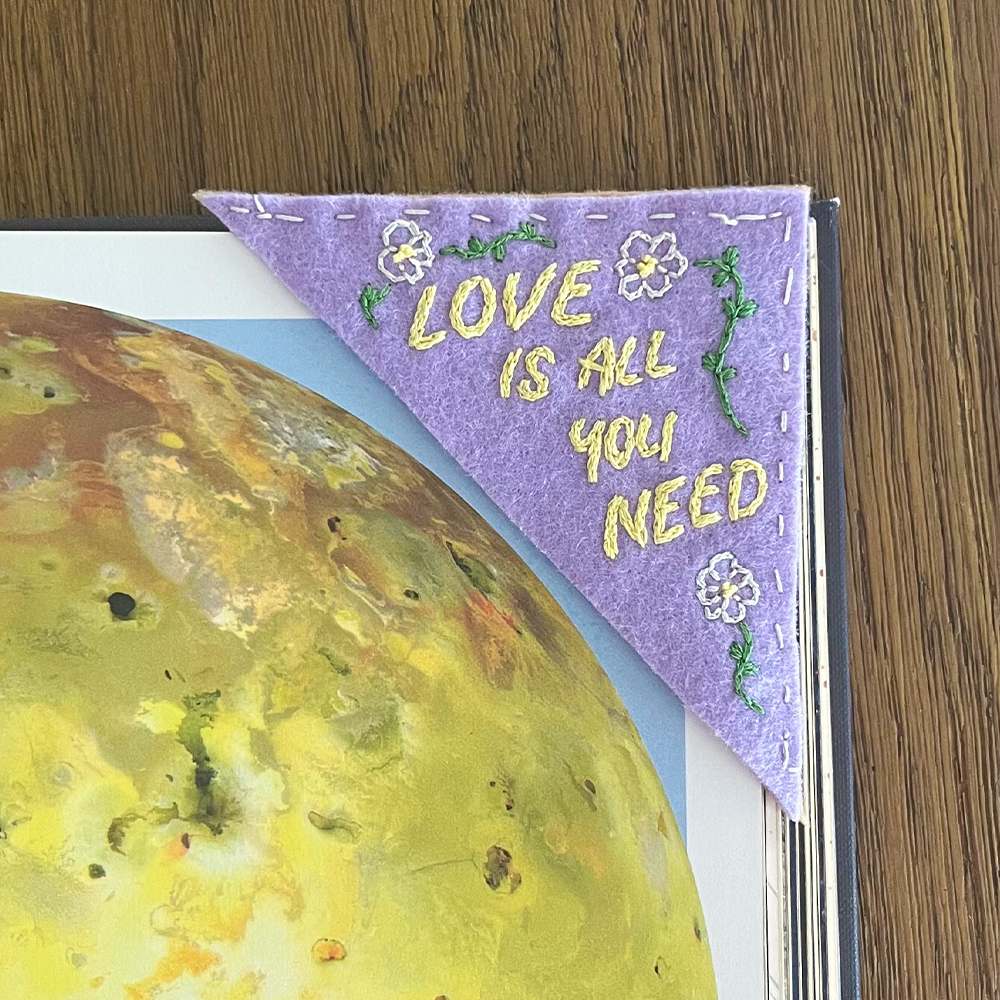 corner bookmark with "love is all you need" stylized text and flower artwork