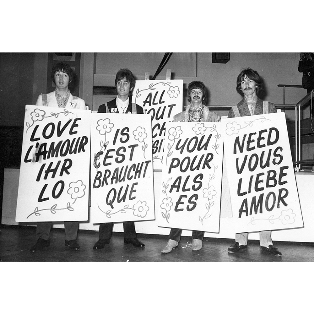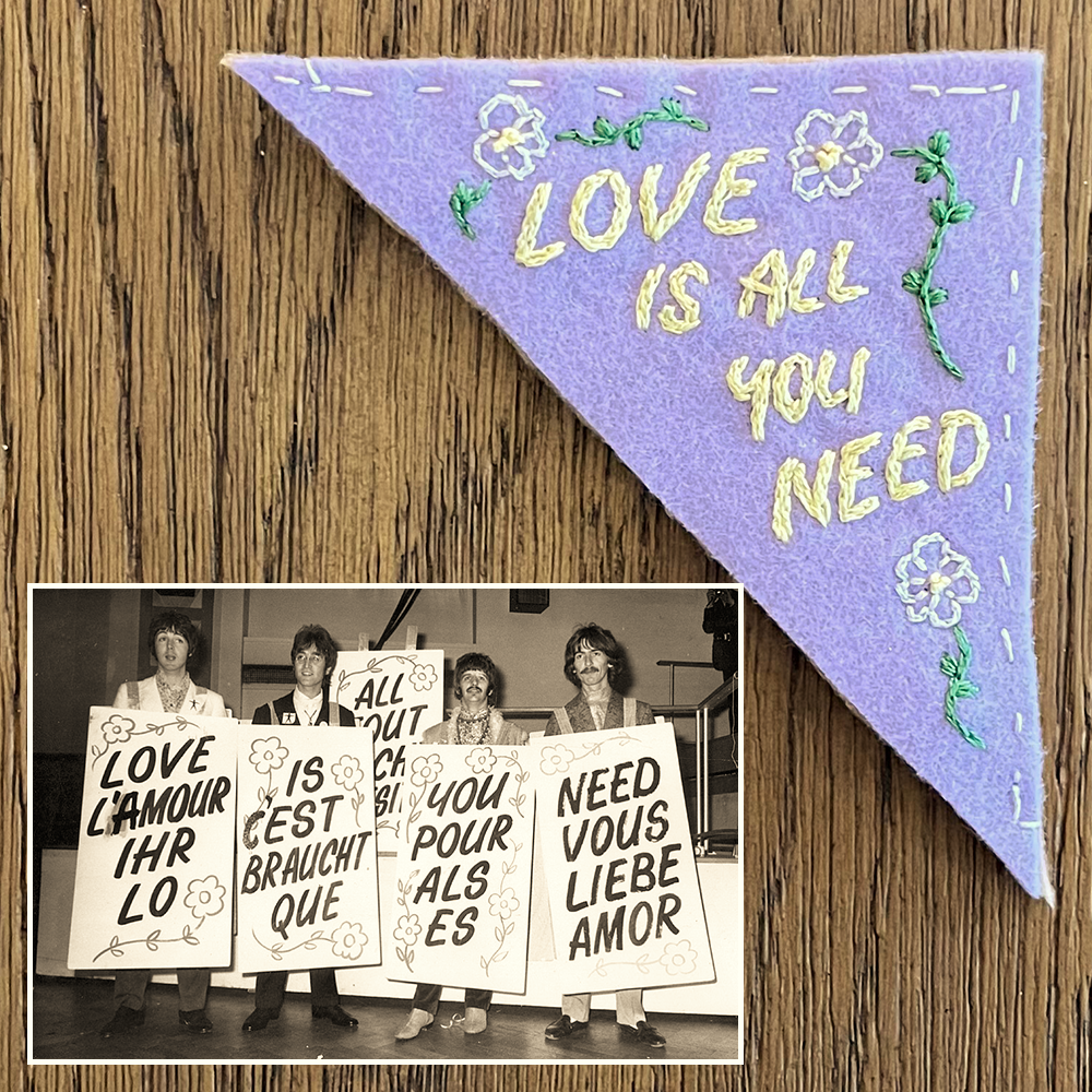 design is based on the props used by the beatles to promote their 1967 performance of the song all you need is love