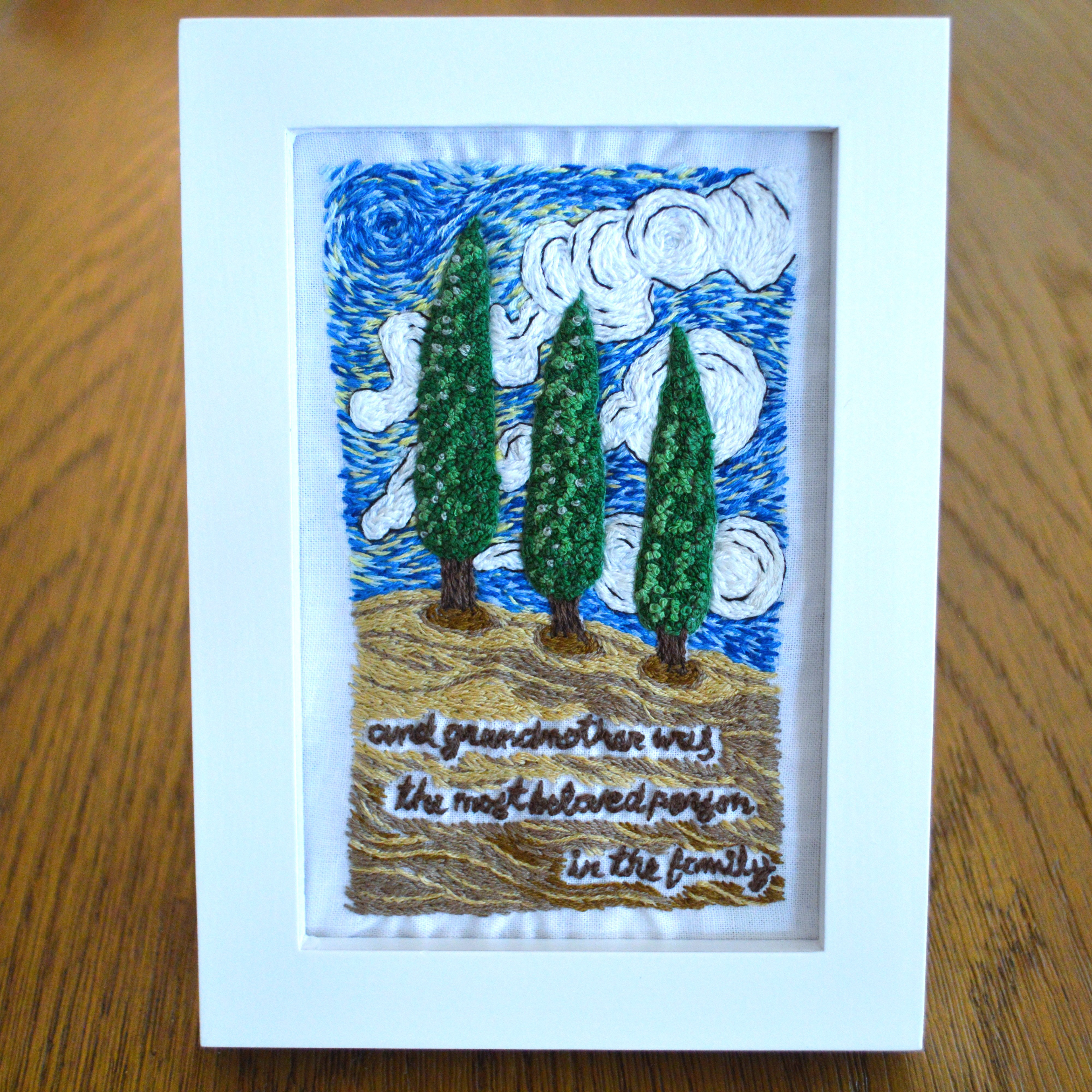 framed landscape piece with "and grandmother was the most beloved person in the family" script